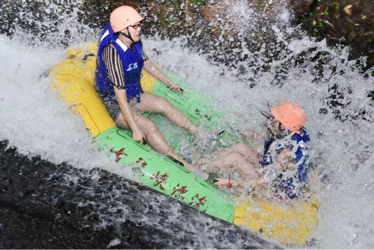漂流中河道落差大,皮艇起伏不定,颠簸剧烈,惊险刺激,很考验心理素质,也有一定的危险性。