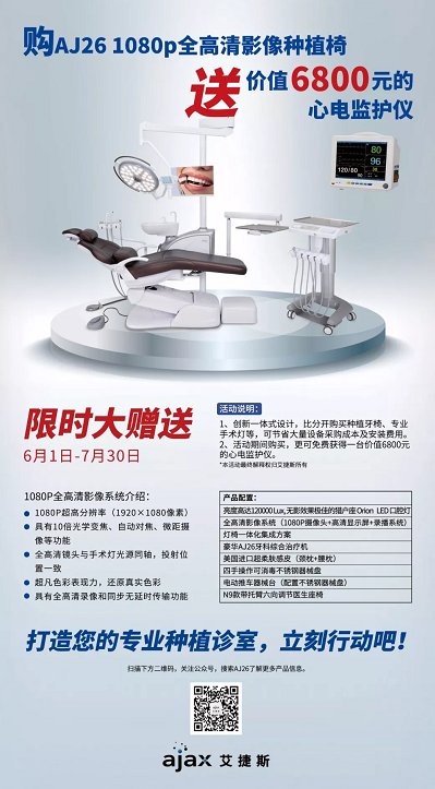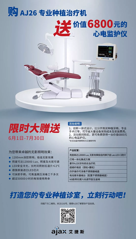 不仅如此,艾捷斯还有限时赠送活动——自6月1日到7月30日期间,购买AJ26专业种植椅送价值6800元的心电监护仪!