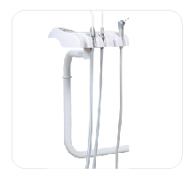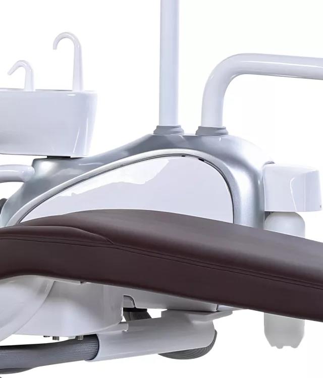 | 铸铝工艺,重量轻,刚性强,确保治疗时工作台面和冷光灯不晃动。 | 侧箱连接件固定在牙椅的中心,相对传统侧边连接,整机更加稳固。 |
