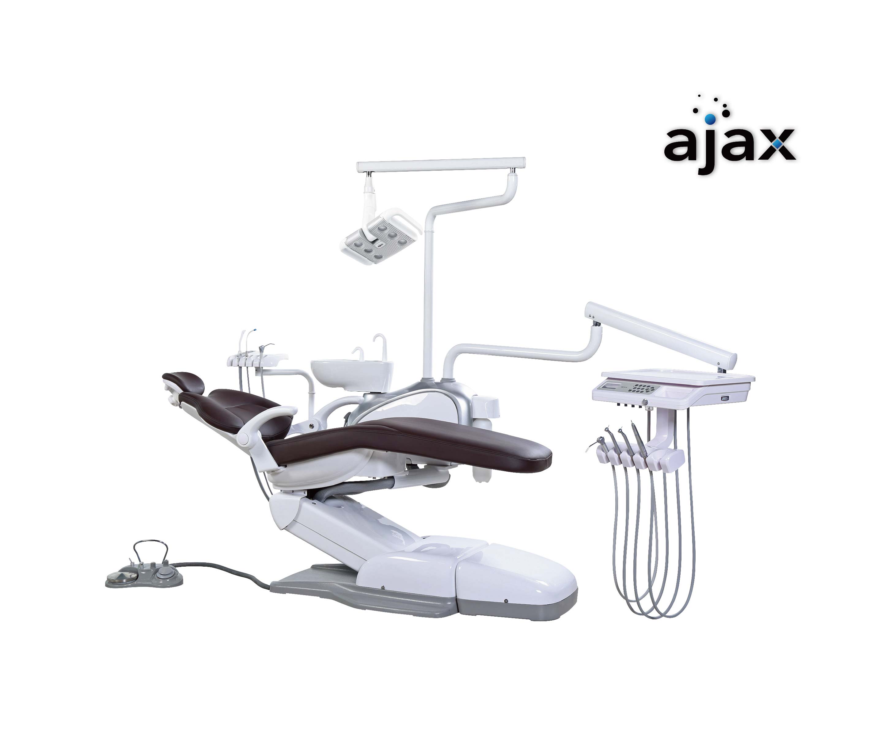 配置表 治疗椅 AJ18椅架整体铸造工艺 金属靠背 豪华缝皮座垫 可旋转扶手 带记忆电机 靠背快速电机 带椅位补偿功能 医生工作台 方形下挂工具盘 可高温消毒硅胶垫 配置手机防回吸系统 带15个功能的按键面板 内置低压观片灯 原装进口手机管线 优质三用枪 助手台 双关节助手杆 带副控按键面板 可高温消毒硅胶垫 带助手三用枪 金属强弱吸手柄 搁物盘 治疗箱体 整体铸铝箱架 可转动箱体 可旋转玻璃痰盂缸 原装进口电磁阀 强吸系统和弱吸系统 带强弱吸延时关闭系统 低压防干烧自动恒温热水器 独立纯净水系统 独立消毒系统 原装进口水气管线 照明 Hubble多功能LED感应灯 地箱 内置地箱 封闭式电源系统 一键水气电开关 带减压阀自动排水系统 双极过滤系统 HPSS稳压系统 脚踏开关 AJAX多功能脚踏 医生座椅 AJAX D3款六向调节医生座椅 | |