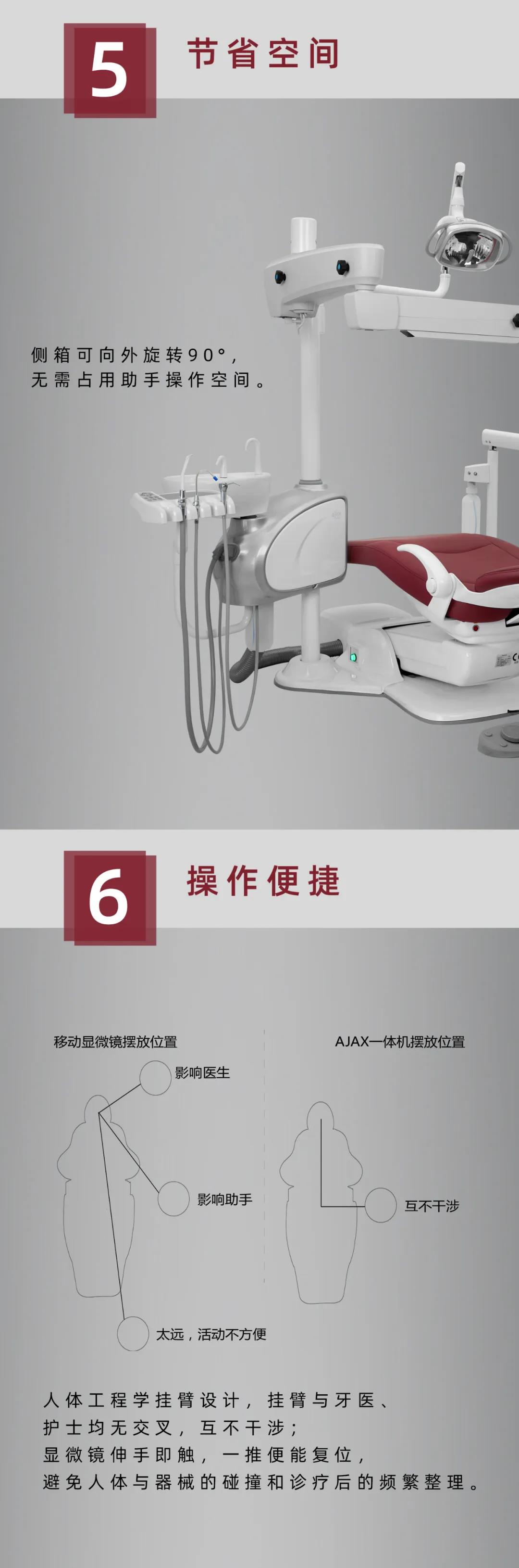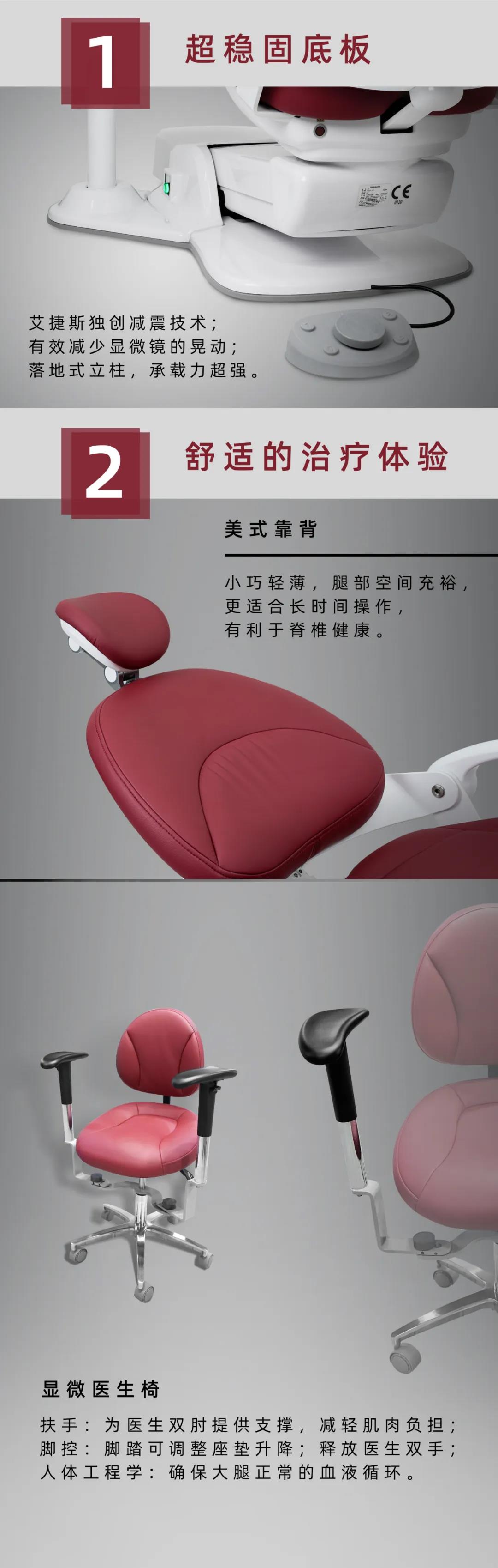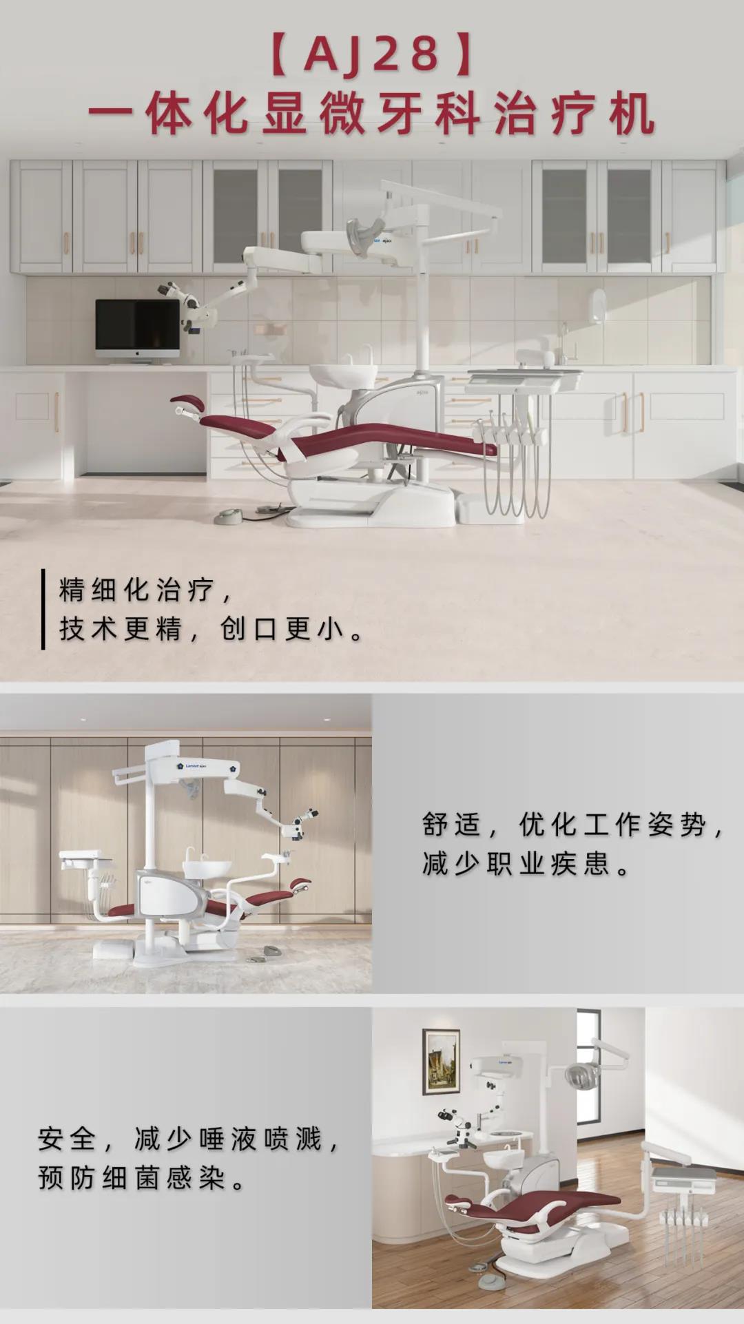 口腔显微技术能实施精细化治疗,减少患者痛苦,优化医生工作姿势,正在迅速发展。 目前牙医多使用移动或吊顶式显微镜,在使用中才容易出现占空间大、妨碍操作、管线凌乱、安装复杂等问题。 艾捷斯针对上述问题,对牙椅进行一系列集成优化,推出了一体化显微牙科治疗机——AJ28。